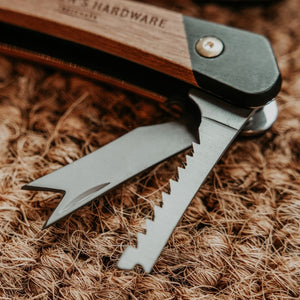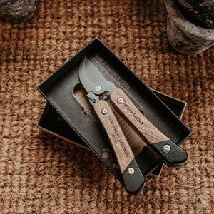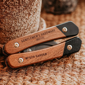 Give your garden the upgrade it needs with the Garden Multi-Tool. This is a one-piece wonder that trims, weeds and snips. It has 6 different functions including secateurs, a root remover, a knife, a saw, a bottle opener, and an easy weeding utensil, each one folding inside its wooden handles.