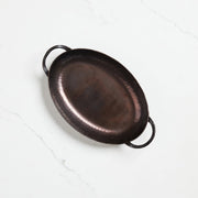 Hand-forged and limited in nature, each oval roaster is visually unique while sharing fundamental design elements including hand hammered handles with a texture designed for easy gripping and a beautiful pre-seasoned interior finish. With performance that rivals cast iron at a lighter weight these roasters are both functional and beautiful workhorses for your kitchen. Perfect for roast chicken and vegetables, grilled fish, baked gratins and much more.