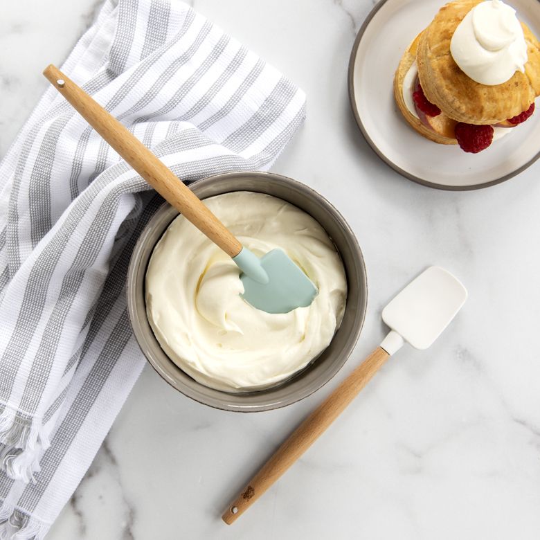 A spoonula and spatula in a size that's perfect for small batches. Silicone heads are dishwasher safe and solid beechwood handles detach for cleaning.