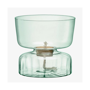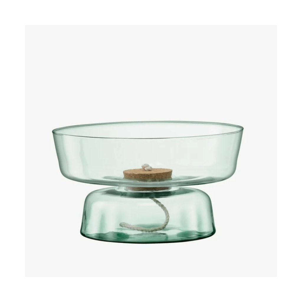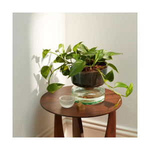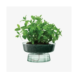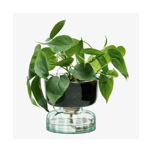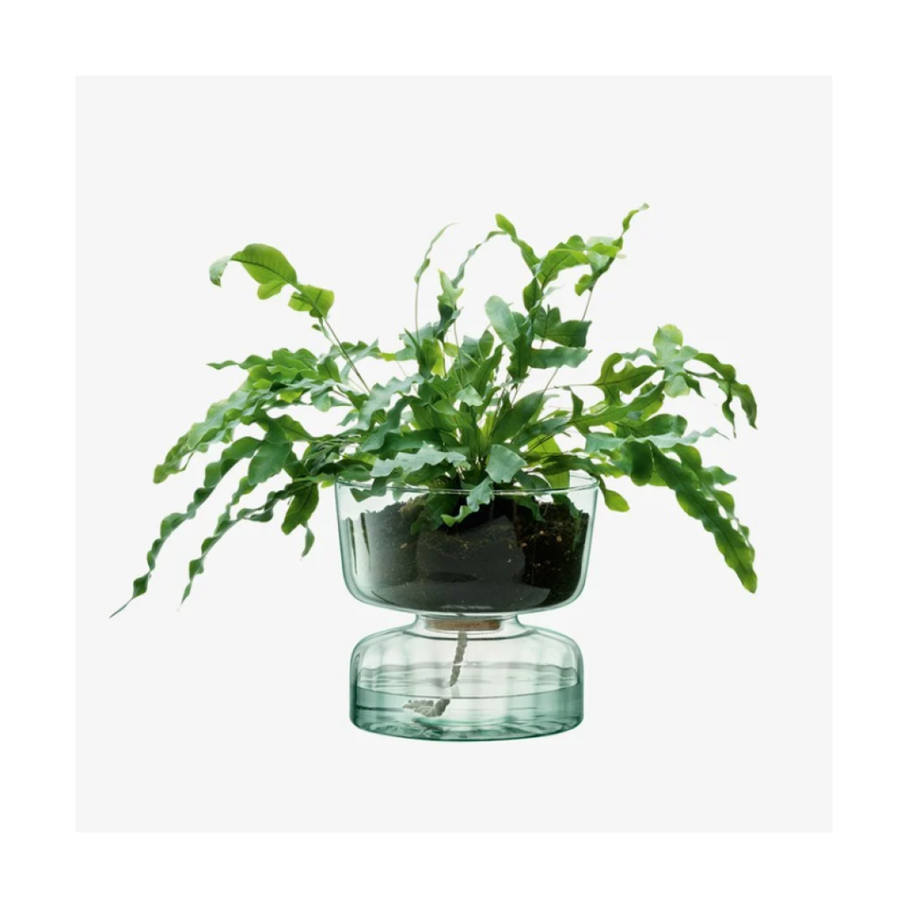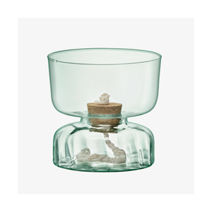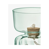 A self-watering planter inspired by the Eden project’s biospheres and focus on sustainability. Mouthblown from recycled glass and fitted with a sustainably-sourced removable cork bung. Fill the lower compartment with water and the top compartment with soil and plants. The cord between the two layers will carry water to the soil.