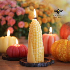 This unique 100% Beeswax Corn Cob candle is perfect for your harvest table setting. This Big Dipper Wax Works original is the perfect addition to all fall tablescapes and centerpieces. Each hand-carved corn candle is unscented and burns for 24 hours. Be careful - this corn is NOT for eating!