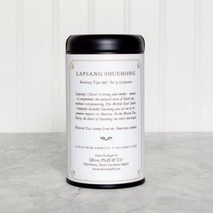 Description: Lapsang's flavor is strong and smoky - meant to complement to the natural taste of black tea, without overpowering. The British East India Company included Souchong teas as its common imports to colonial America. In the Boston Tea Party, 35 chests of Souchong tea were destroyed.