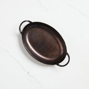 Hand-forged and limited in nature, each oval roaster is visually unique while sharing fundamental design elements including hand hammered handles with a texture designed for easy gripping and a beautiful pre-seasoned interior finish. With performance that rivals cast iron at a lighter weight these roasters are both functional and beautiful workhorses for your kitchen. Perfect for roast chicken and vegetables, grilled fish, baked gratins and much more.