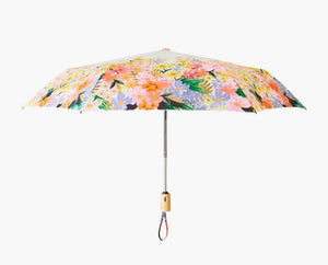 The cheerful blooms of our Marguerite print will brighten any rainy day. Our new umbrella features a wooden handle, a patterned sleeve, and an auto open/close function.
