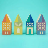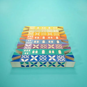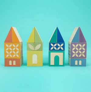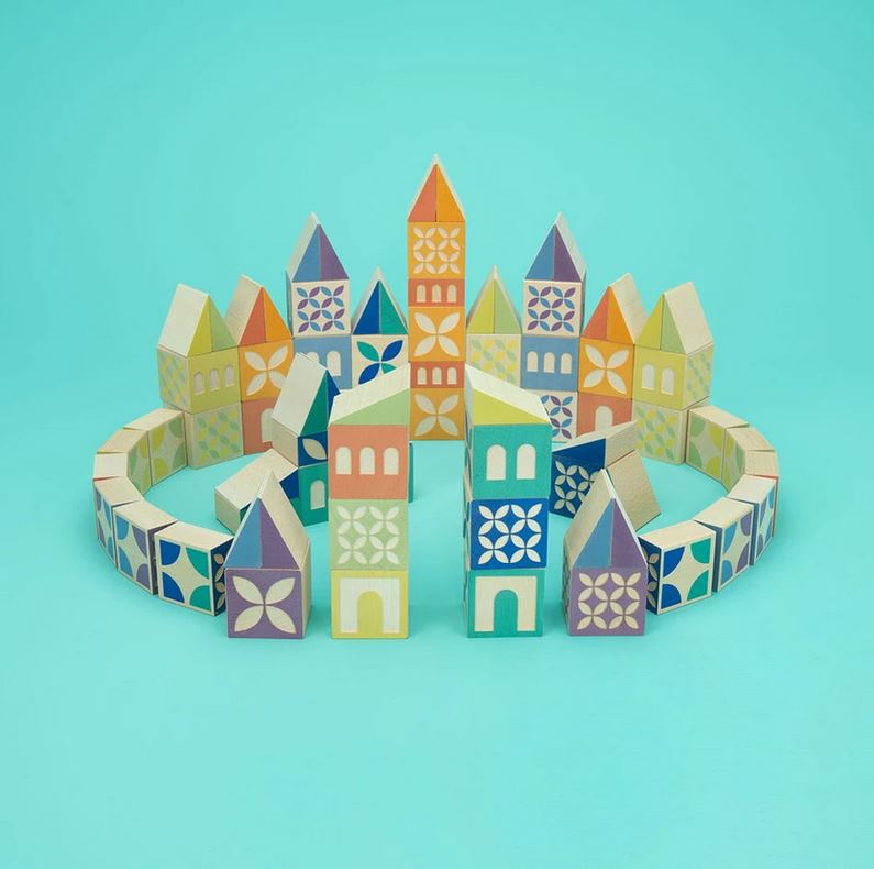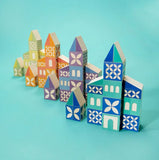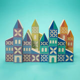 Build your own village with this 80 piece set: 32 blocks, 32 triangles, and 16 half-blocks. Construct buildings, towers, and bridges with bright colors and mod patterns. You'll find a door, a window, or an archway debossed on one side of each block or half-block: a decorative pattern is debossed on its opposing side. Colorful triangles can form rooftops, bridge bases, and more.